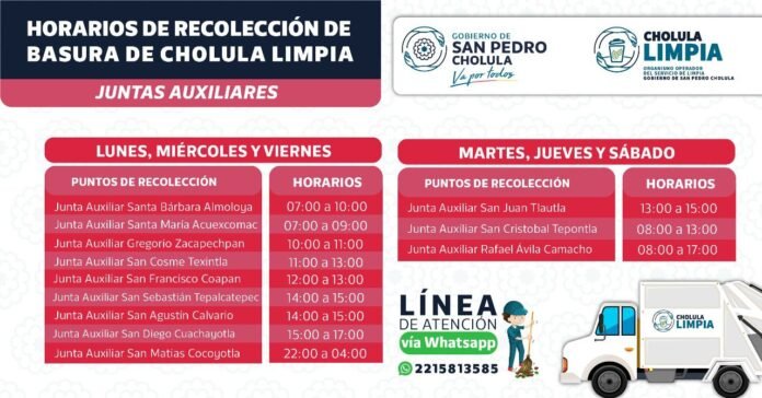 Se exhorta a la ciudadanía en general a tirar su basura en bolsas cerradas y colocarlas al pie de su vivienda o comercio, así como apegarse a los horarios por día, hora y zona, pues en la medida en la que las y los cholultecas asimilen y respeten el nuevo esquema de recolección, mantendremos limpio y ordenado nuestro municipio.