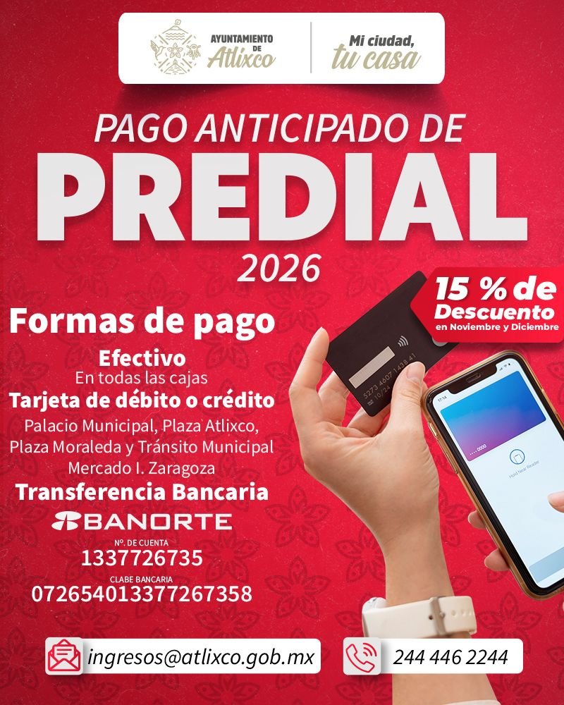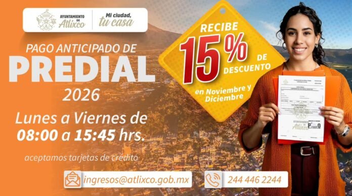 Atlixco, Puebla.- El Ayuntamiento de Atlixco, encabezado por la presidenta Ariadna Ayala, informó que durante noviembre y diciembre las y los contribuyentes podrán obtener un 15% de descuento al realizar el pago anticipado del Predial 2026, como parte de los estímulos fiscales que promueven el cumplimiento y apoyan la economía familiar.