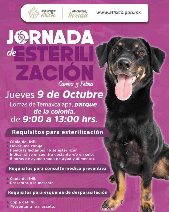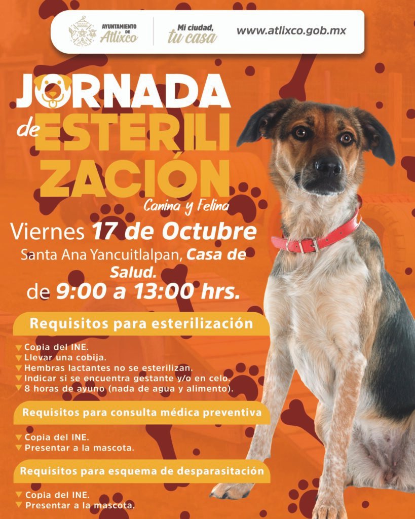 Atlixco, Puebla.- El Ayuntamiento de Atlixco, encabezado por la presidenta Ariadna Ayala, invita a la ciudadanía a participar en las Jornadas Gratuitas de Esterilización y Atención Médica Animal, una iniciativa que promueve la tenencia responsable y el bienestar de los animales de compañía, pilares fundamentales de una sociedad más empática y consciente.