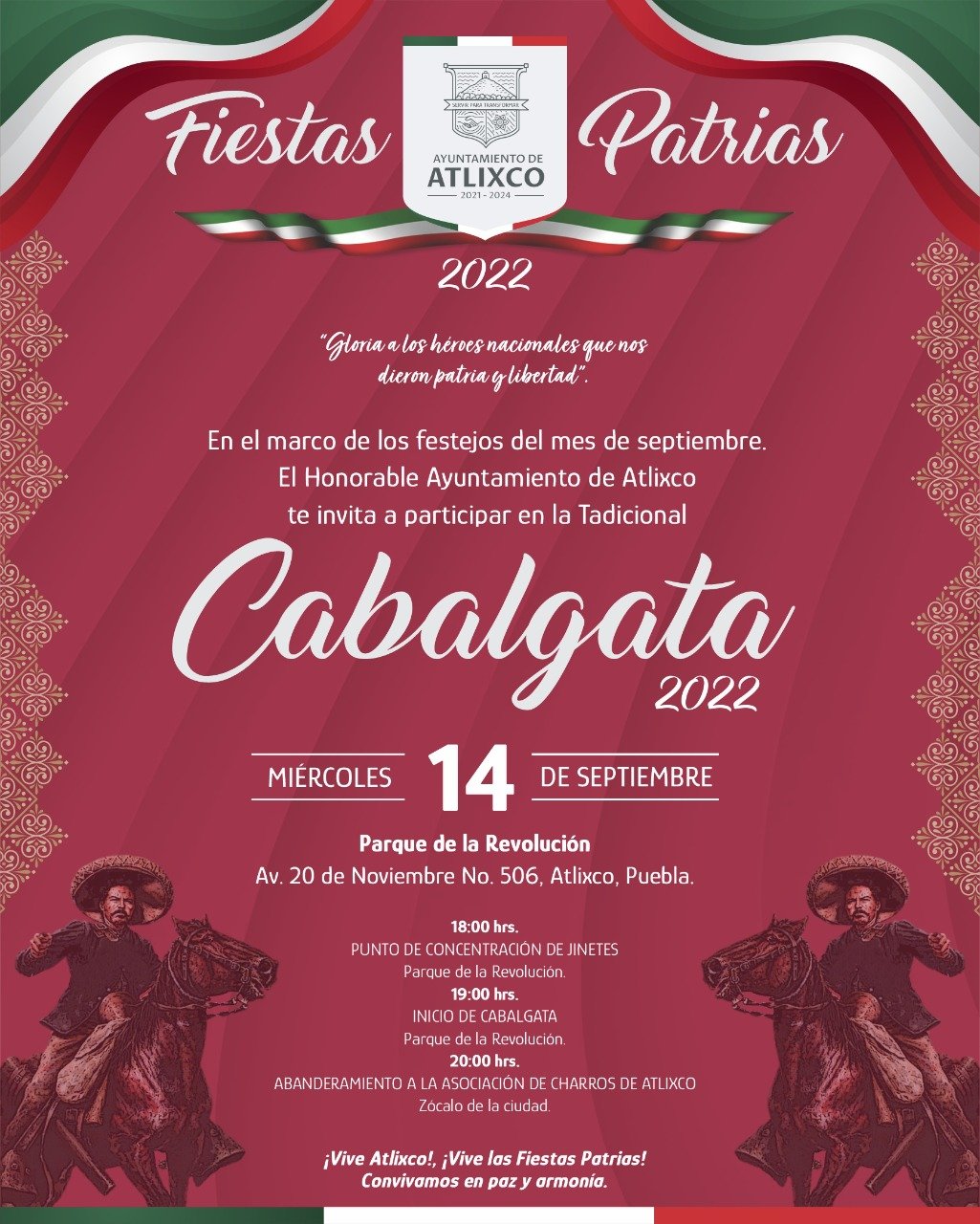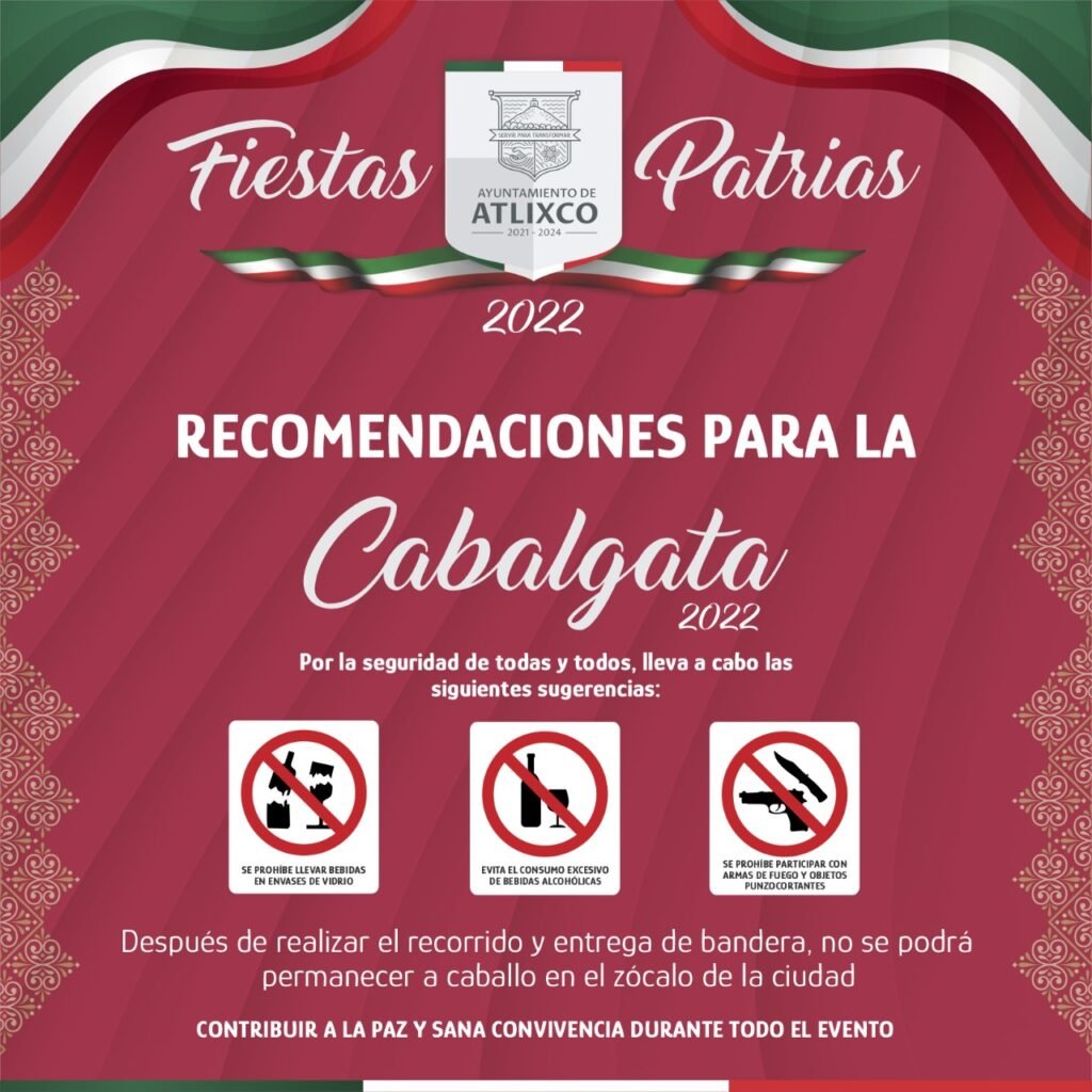 Atlixco, Puebla.- En el marco de los festejos por los 212 años del Inicio de la Independencia de México., el Ayuntamiento de Atlixco invita a disfrutar este miércoles 14 de septiembre de la Tradicional Cabalgata en paz y armonía, tomando en cuenta las siguientes recomendaciones:
