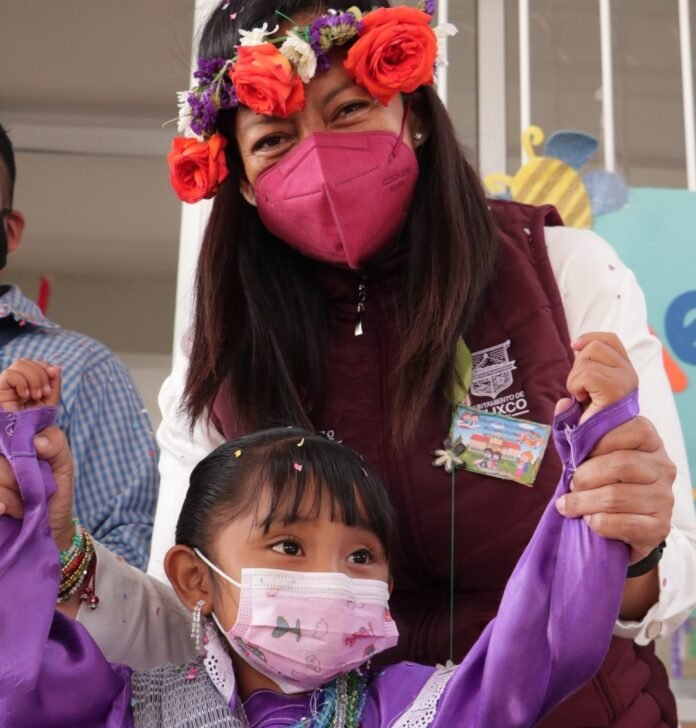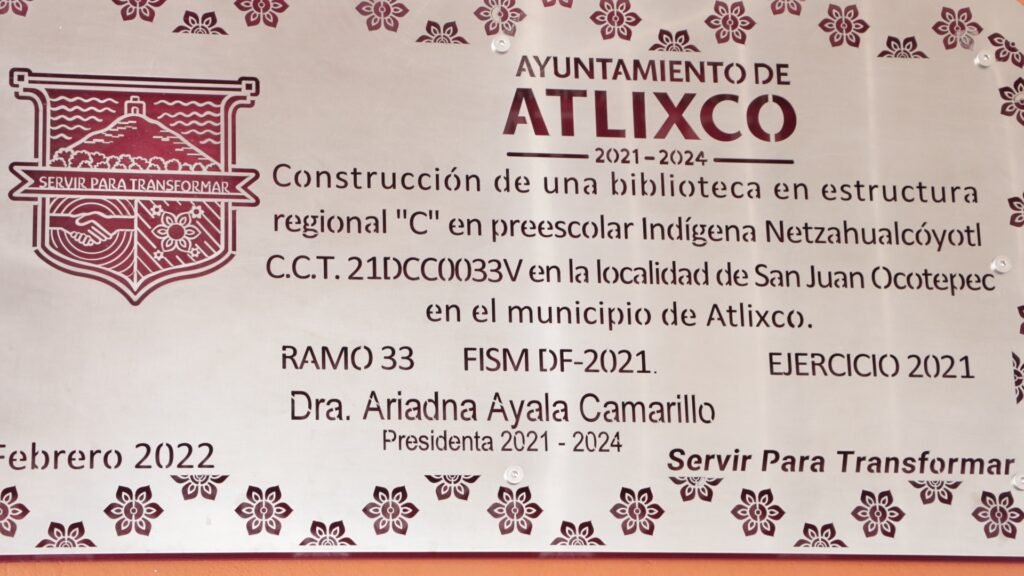 Atlixco, Puebla.- Refrendando su compromiso para mejorar las condiciones que permitan el acceso equitativo a la lectura y la escritura para niñas y niños, la Presidenta Municipal de Atlixco, Ariadna Ayala inauguró la construcción de un Biblioteca en estructura regional tipo C, en el Preescolar Indígena Netzahualcóyotl, perteneciente a la Junta Auxiliar de San Juan Ocotepec.