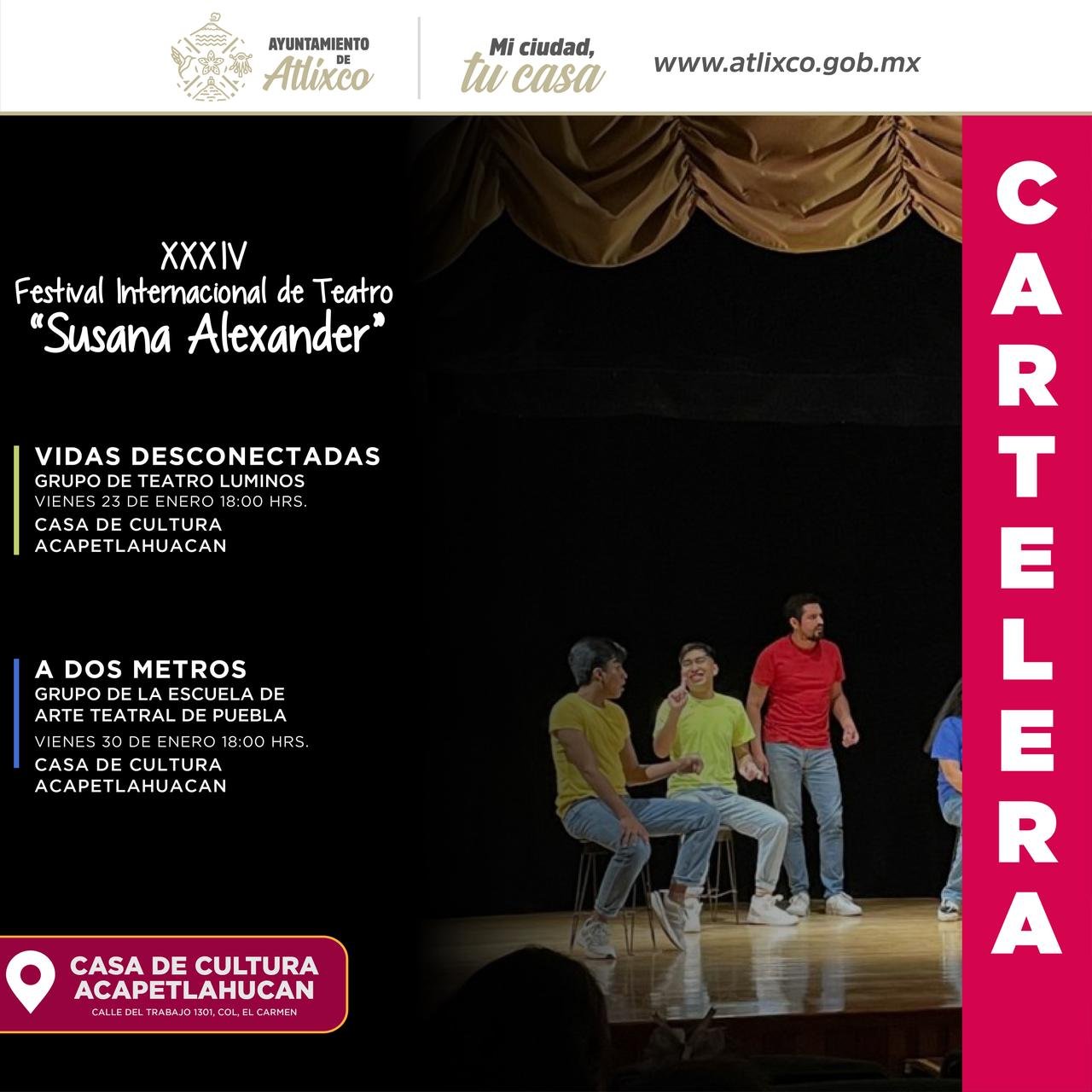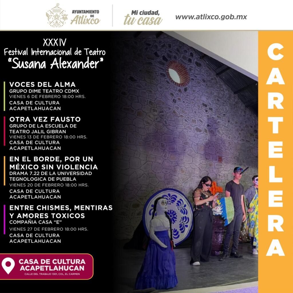 Atlixco, Puebla.- La presidenta de Atlixco, Ariadna Ayala, invita a la ciudadanía a disfrutar del XXXIV Festival Internacional de Teatro Susana Alexander, que se llevará a cabo en la Casa de Cultura Acapetlahuacan, con la participación de compañías locales y nacionales.