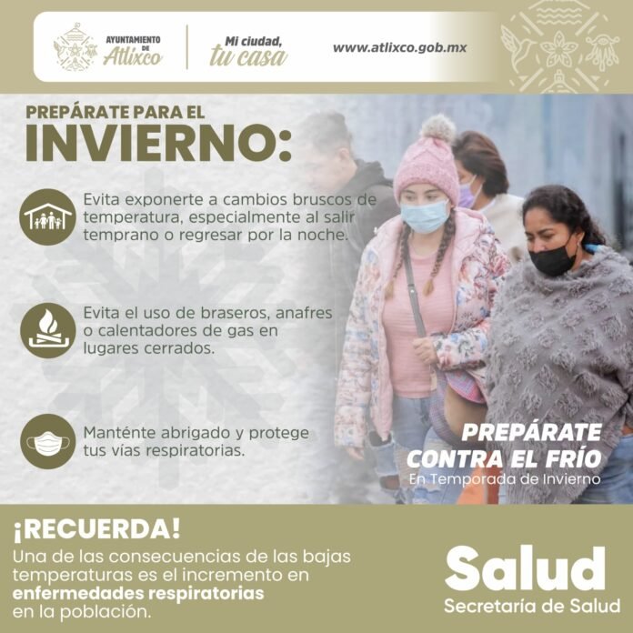 Atlixco, Puebla.- La presidenta de Atlixco, Ariadna Ayala, a través de la Dirección de Protección Civil, exhorta a la ciudadanía a reforzar las acciones preventivas ante la llegada del invierno y la temporada de frentes fríos, con el fin de proteger la salud y el bienestar de las familias atlixquenses.