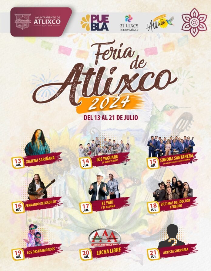 Atlixco, Puebla.- La presidenta municipal, Ariadna Ayala, acompañada del comité organizador, presentó la cartelera de la Feria de Atlixco 2024, que se realizará en el Centro de Convenciones del 13 al 21 de julio.