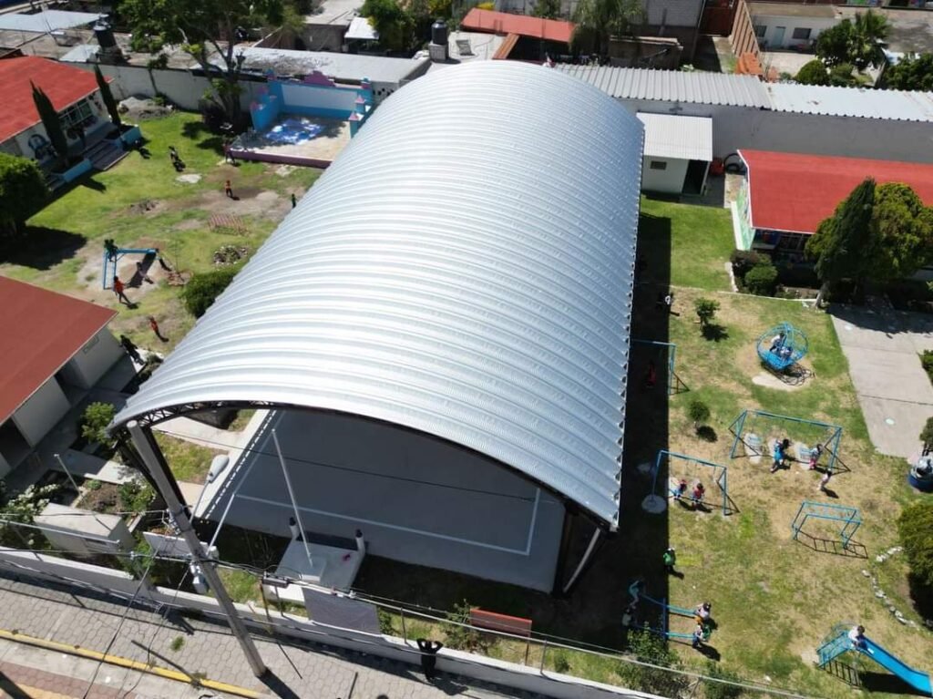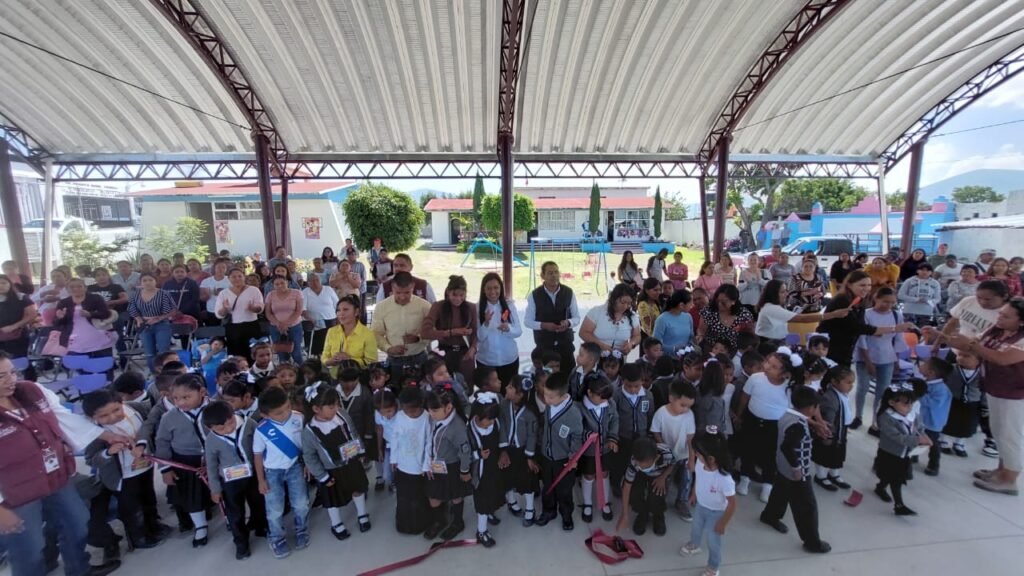 El techado fue construido en una superficie de 381.04 metros cuadrados con bajadas de canales pluviales para prevenir afectaciones por las lluvias, además de que, atendiendo las necesidades de la comunidad, durante el desarrollo de los trabajos, se rehabilitaron 290 metros cuadrados de la Plaza Cívica, obra que abona al desarrollo integral de niñas y niños.