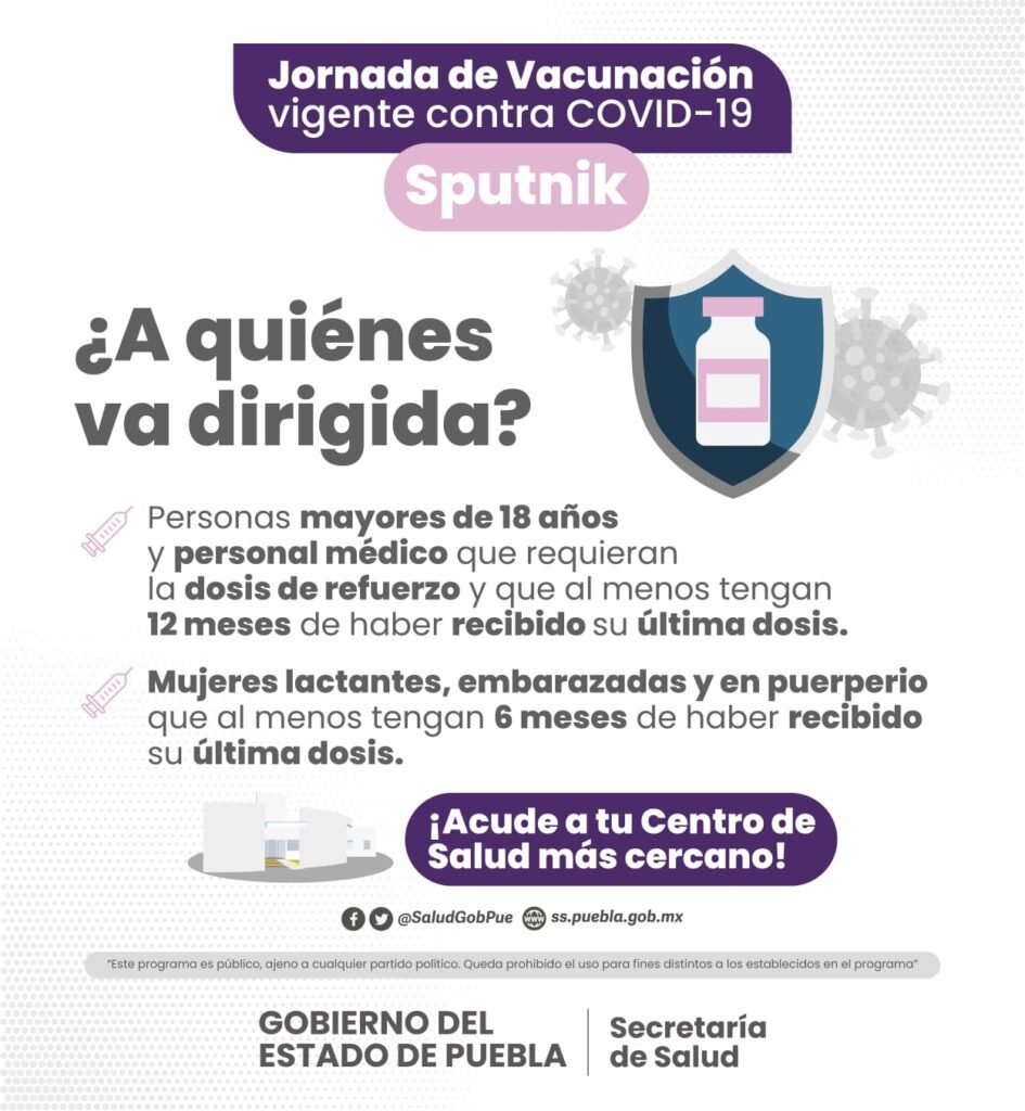 Dirigida a personas mayores de 18 años, personal médico que al menos tengan 12 meses de haber recibido la última dosis, así como a mujeres lactantes, embarazadas y en puerperio con menos de 6 meses de su última aplicación, se estará colocando el biológico de la marca Sputnik.