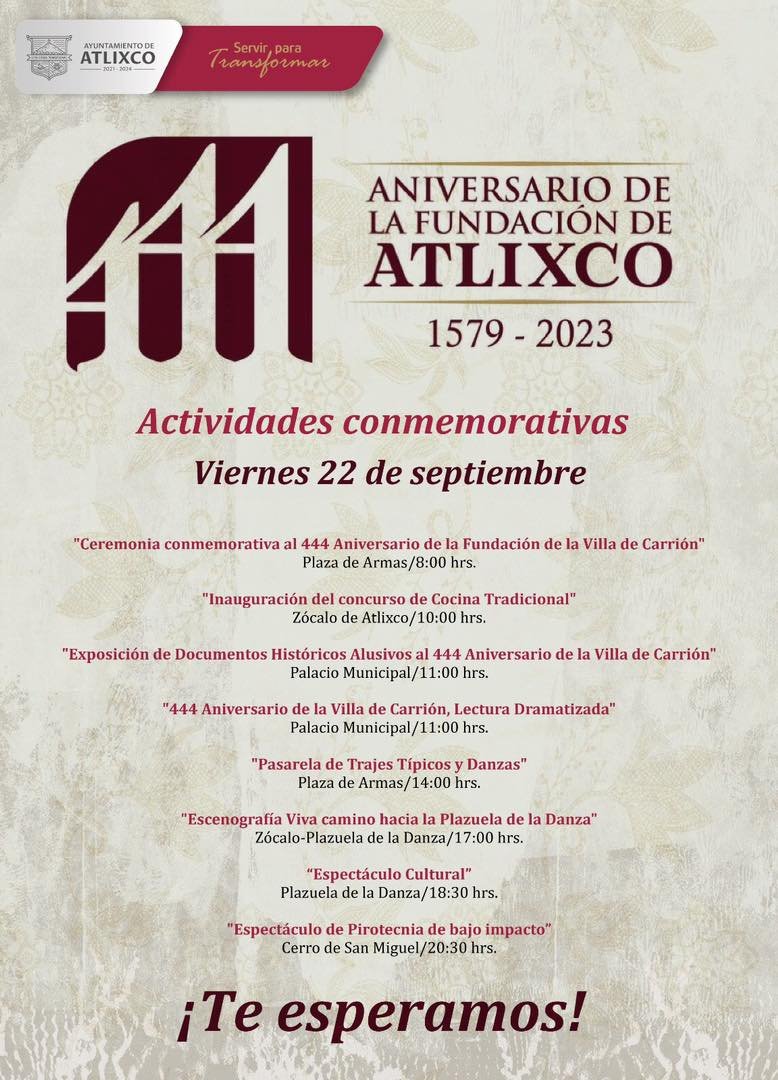 Atlixco, Puebla.- El Gobierno Municipal que encabeza Ariadna Ayala, invita a celebrar el 444 aniversario de la Fundación de Atlixco como Villa de Carrión el próximo viernes 22 de septiembre a través de las diversas actividades que ha preparado, a fin de promover la identidad y reforzar el sentimiento de pertenencia entre las y los atlixquenses.