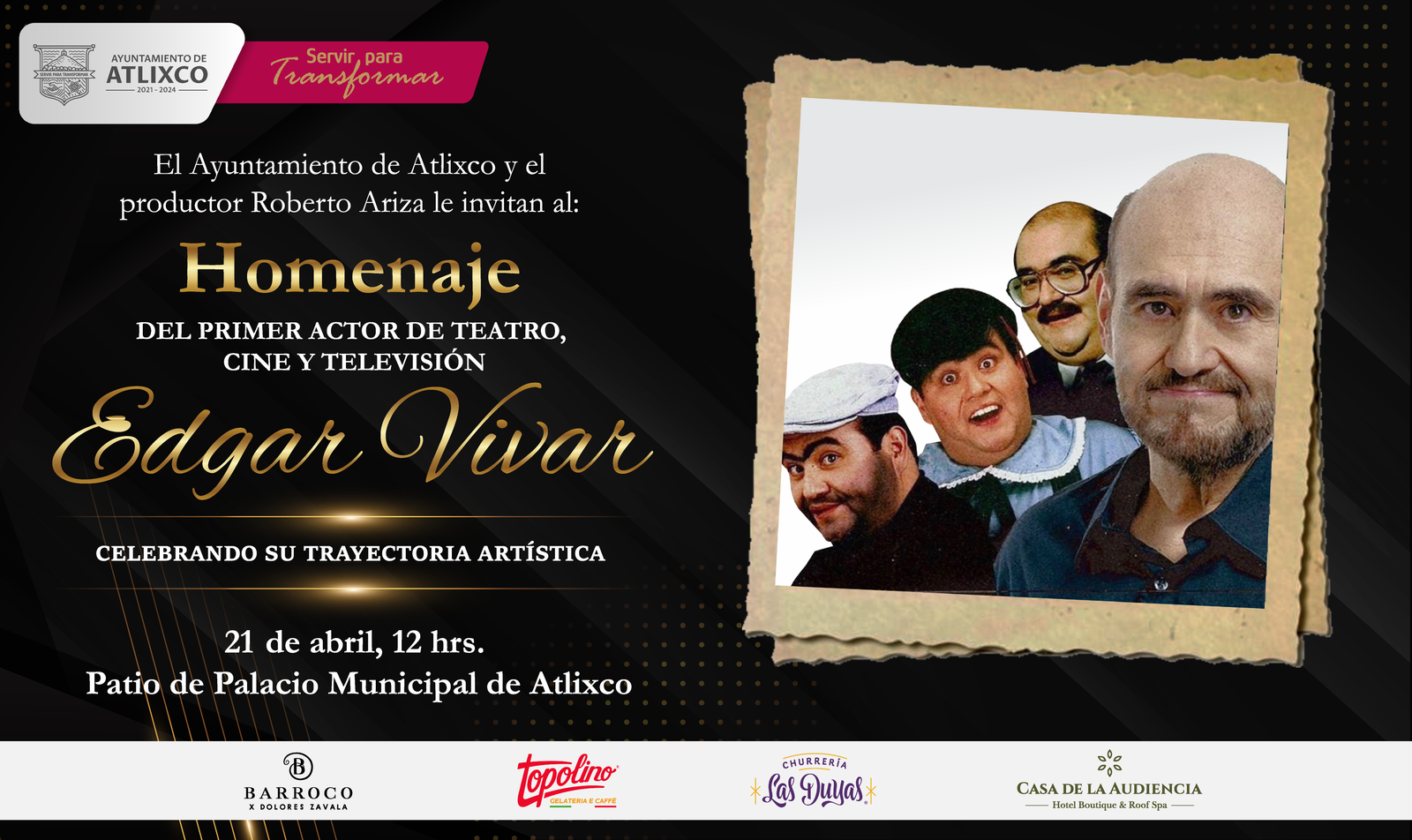 Ángel Édgar Vivar Villanueva se hizo famoso por haber interpretado al personaje del Señor Barriga y a Ñoño en El Chavo del 8 y al Botija en Los caquitos, y también en el doblaje en películas de Walt Disney Pixar como Ratatouille, donde prestó su voz al chef Auguste Gusteau, y Up: una aventura de altura, donde hizo la voz del perro Dug. Actualmente forma parte del elenco de la serie de televisión “Vecinos”. El famoso señor Barriga estará en el palacio Municipal de Atlixco el día viernes 21 de Abril en punto del medio día para recibir el cariño de los atlixquenses y visitantes en tan merecido homenaje.