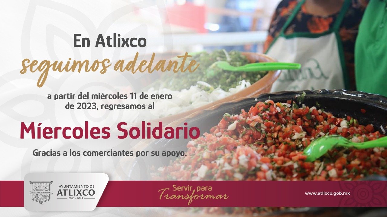 Atlixco, Puebla.- Tras concluir las ventas por temporada decembrinas, el Ayuntamiento de Atlixco a través de la Dirección de Industria y Comercio, anunció el regreso del operativo “Miércoles Solidario” a partir de este 11 de enero del año 2023, esto, con el objetivo de mantener el orden comercial y la movilidad de las calles.