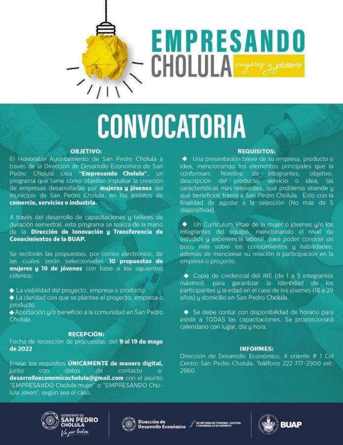 Las mujeres y jóvenes interesados en participar en “Empresando Cholula”, podrán enviar sus proyectos al correo desarrolloeconomicocholula@gmail.com, con los siguientes requisitos: