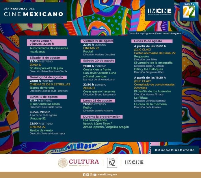 Ciudad de México.- Con motivo del Día Nacional del Cine Mexicano, Canal 22 ha preparado una cartelera especial conformada por obras fílmicas contemporáneas, documentales, cortometrajes infantiles, cápsulas y programas dedicados al séptimo arte. Los martes a las 22:00 horas y los jueves a las 22:30 horas previo al inicio de Cinema 22, se transmite Autorretratos de cineastas mexicanas, miniserie de cápsulas documentales, en las que 12 distintas cineastas mexicanas proyectan sus procesos creativos, sus narrativas, sus estilos y la forma en que perciben sus propias creaciones. Algunas de las realizadoras son Luna Marán, Sofía Carrillo, Lucía Gajá, Claudia Sainte-Luce e Itandehui Jansen.