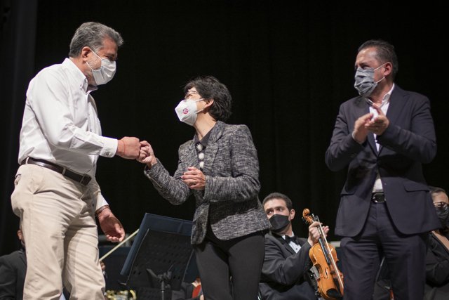 Por la noche, se llevó a cabo el concierto “De Beethoven a Revueltas; juventud y contrastes sonoros”, a cargo de la Orquesta Sinfónica, bajo la dirección del maestro David Pérez Olmedo, a quien la Rectora le dio la bienvenida, deseándole éxito en su nueva tarea.