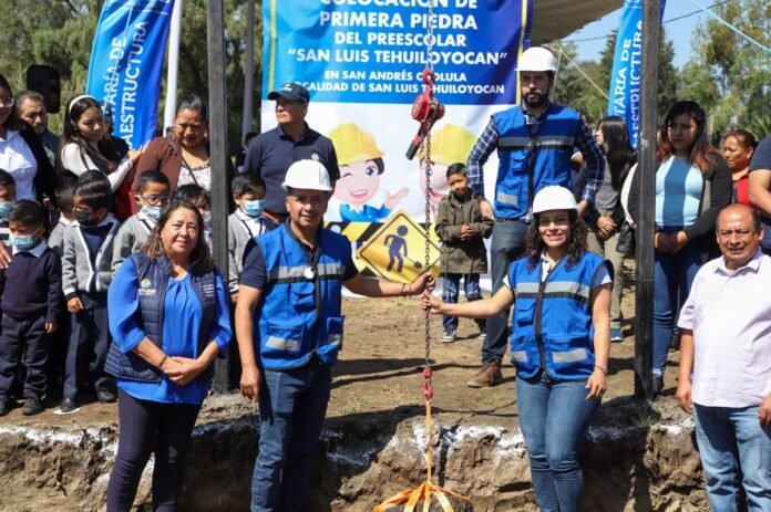 San Andrés Cholula, Puebla. – El Ayuntamiento de San Andrés Cholula, a través de la Secretaría de Infraestructura, llevó a cabo la colocación de la primera piedra del preescolar San Luis Tehuiloyocan, en dicha junta auxiliar.