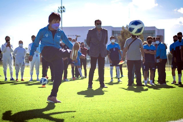 Puebla, México. – Comprometida con el deporte universitario, la Rectora Lilia Cedillo Ramírez inauguró con la tradicional patada de apertura la cancha 5 de fútbol soccer, frente a la Unidad de Seminarios en Ciudad Universitaria, luego de los trabajos de mantenimiento y rehabilitación que se hicieron a este espacio que beneficiará a mil 500 estudiantes.
