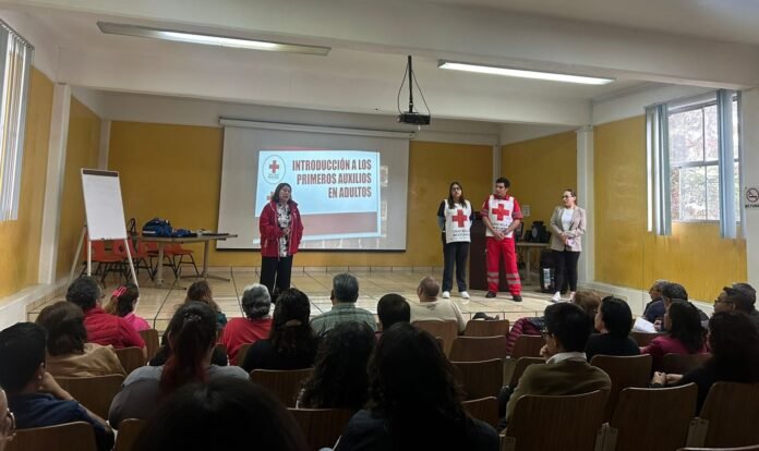 Durante la dinámica que estuvo a cargo de un médico, un paramédico y un primer respondiente de la Delegación Teziutlán de Cruz Roja, las y los maestros, así como administrativos del centro educativo, aprendieron técnicas de Reanimación Cardiopulmonar (RCP), cómo actuar ante hemorragias y traumatismos, la importancia de la seguridad del interviniente, el manejo de obstrucciones de la vía aérea, y la atención a lesiones por calor o frío a fin de estabilizar al paciente hasta que pueda otorgarle atención un profesional médico.