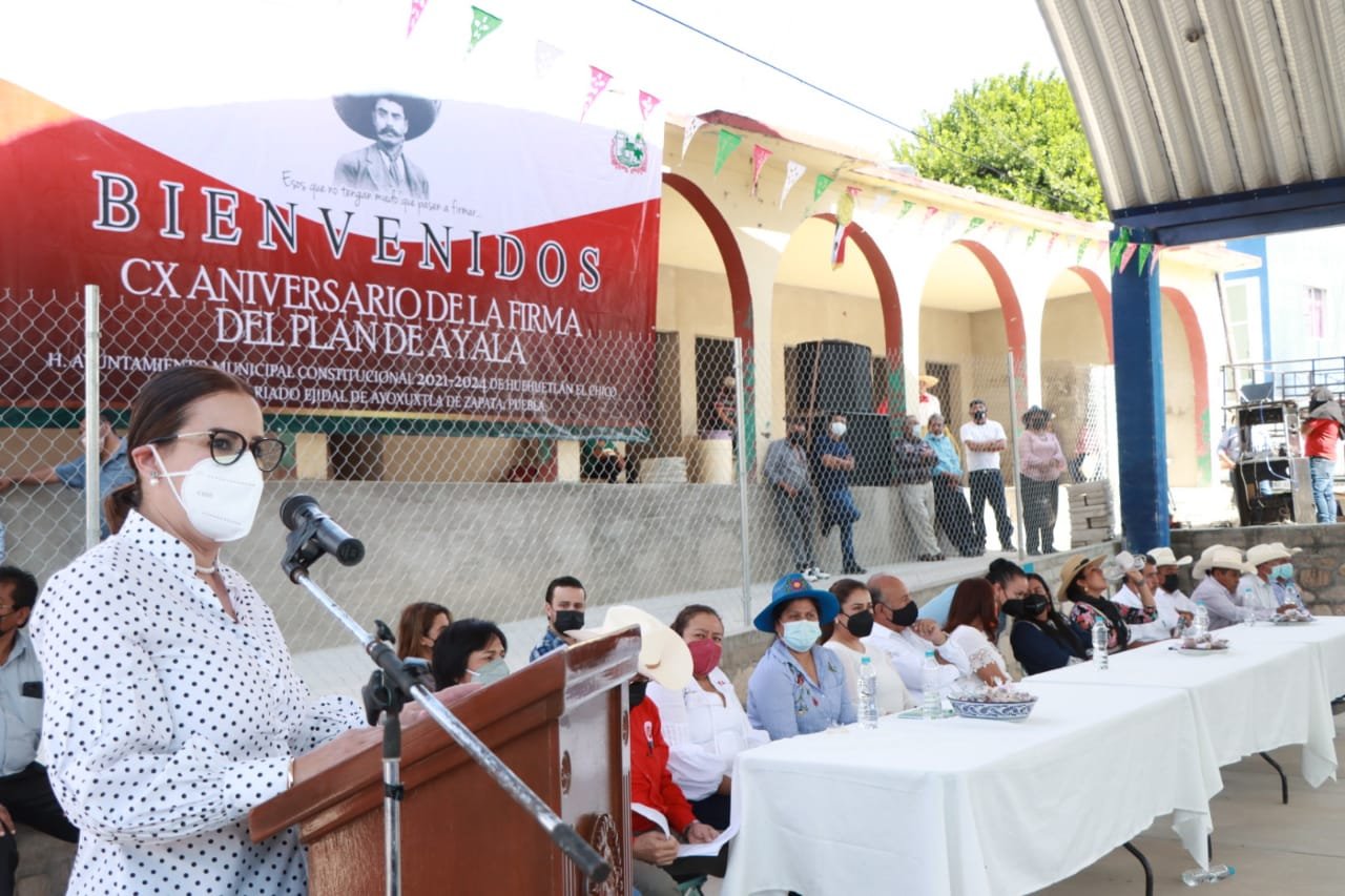 Huehuetlán El Chico, Puebla.- Al conmemorar el CX Aniversario de la Firma de “El Plan de Ayala”, encabezado por Emiliano Zapata el 28 de noviembre de 1911; la secretaria de Gobernación, Ana Lucía Hill Mayoral señaló que es un acto que prevalece, ya que en la actualidad se honra con acciones para proveer el bienestar a los pueblos vulnerables, erradicar la miseria, y saldar esa deuda histórica de democratización agrarista.