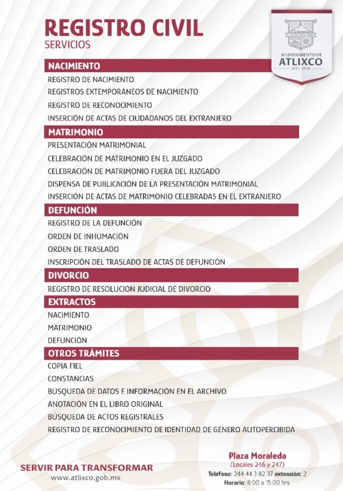 Atlixco, Puebla.- Con la finalidad de continuar ofreciendo un trato de calidad en instalaciones dignas, así como mantener informada a la ciudadanía sobre los trámites, el Ayuntamiento de Atlixco que encabeza Ariadna Ayala, pone a disposición los servicios que ofrece el Registro Civil Municipal.