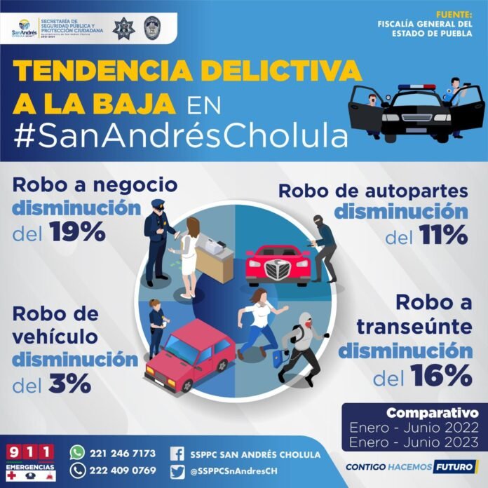 San Andrés Cholula, Puebla.- Como resultado de las labores de inteligencia y prevención del delito, la Secretaría de Seguridad Pública y Protección Ciudadana (SSPPC) de San Andrés Cholula, reportó que se mantiene tendencia a la baja en diversos delitos, de acuerdo al último reporte emitido por la Fiscalía General del Estado de Puebla (FGE).