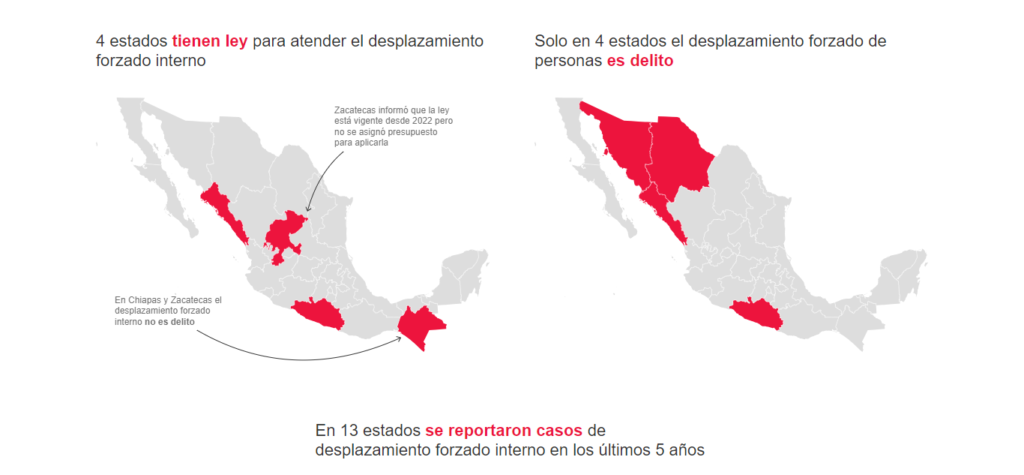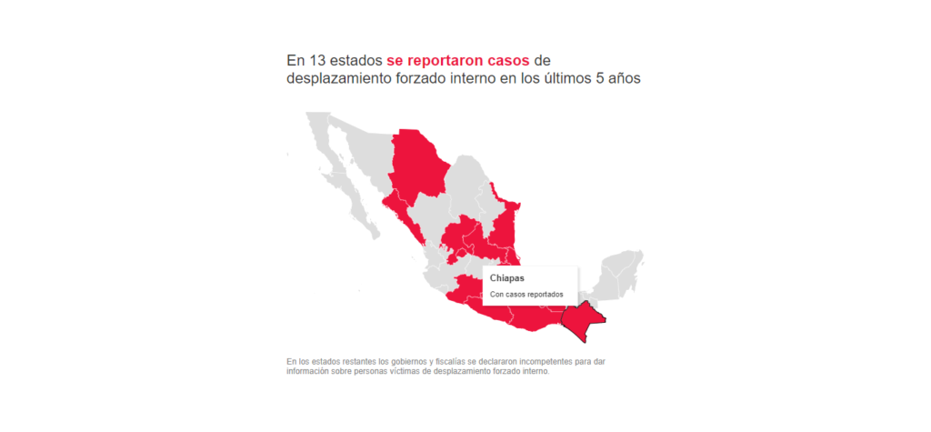 Tan solo en 2023, la Comisión Mexicana de Defensa y Promoción de los Derechos Humanos (CMDPDH), una organización no gubernamental que forma parte de la Red Internacional de Derechos Humanos, registró más de 40 hechos de desplazamiento por violencia en al menos once estados: Chiapas, Chihuahua, Zacatecas, Guerrero, Michoacán, Tamaulipas, Oaxaca, San Luis Potosí, Sinaloa, Sonora y Estado de México. Esto representa un aumento de 160% con relación a 2022, cuando se presentaron 25 eventos.