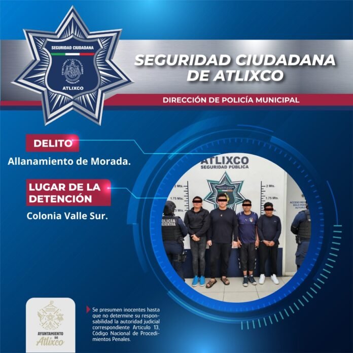 Atlixco, Puebla.- Elementos de la Secretaría de Seguridad Ciudadana de Atlixco detuvieron a cuatro hombres por su presunta participación en el delito de allanamiento de morada en la colonia Valle Sur.