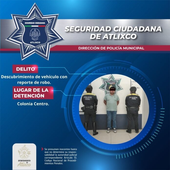 Atlixco, Puebla.- La Secretaría de Seguridad Ciudadana de Atlixco, a través de la Dirección de Tránsito y Vialidad, aseguró una camioneta con reporte de robo y detuvo a un hombre por el probable delito de detentación de vehículo robado.