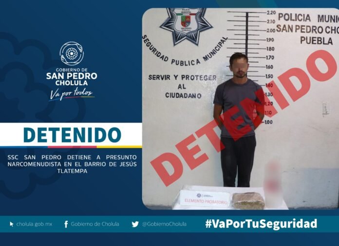 San Pedro Cholula, Puebla.- Como resultado de los operativos de vigilancia implementados para inhibir la comisión de delitos en el municipio, elementos de la Secretaría de Seguridad Ciudadana aseguraron a Edgar Efraín “N”, en el Barrio de Jesús Tlatempa, por el presunto delito de posesión de estupefacientes.