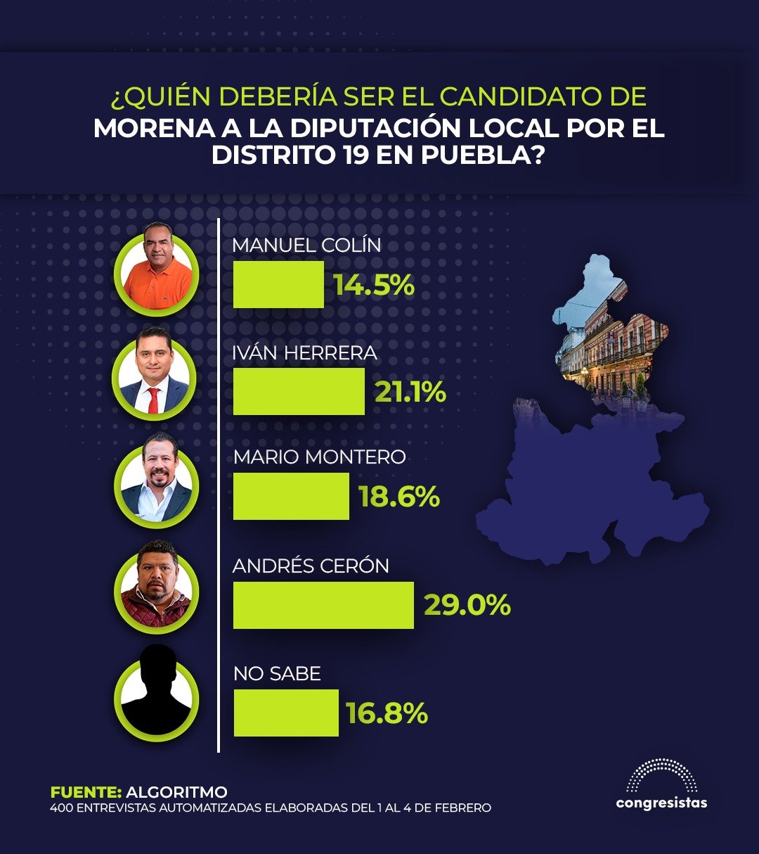 Se trata de Manuel Colín, Iván Herrera, Mario Montero y Andrés Cerón, los cuales fueron ya medidos por Algoritmo, quien, a través de 400 entrevistas automatizadas y elaboradas del 1 al 4 de febrero, permitió conocer quién es el puntero en este distrito.