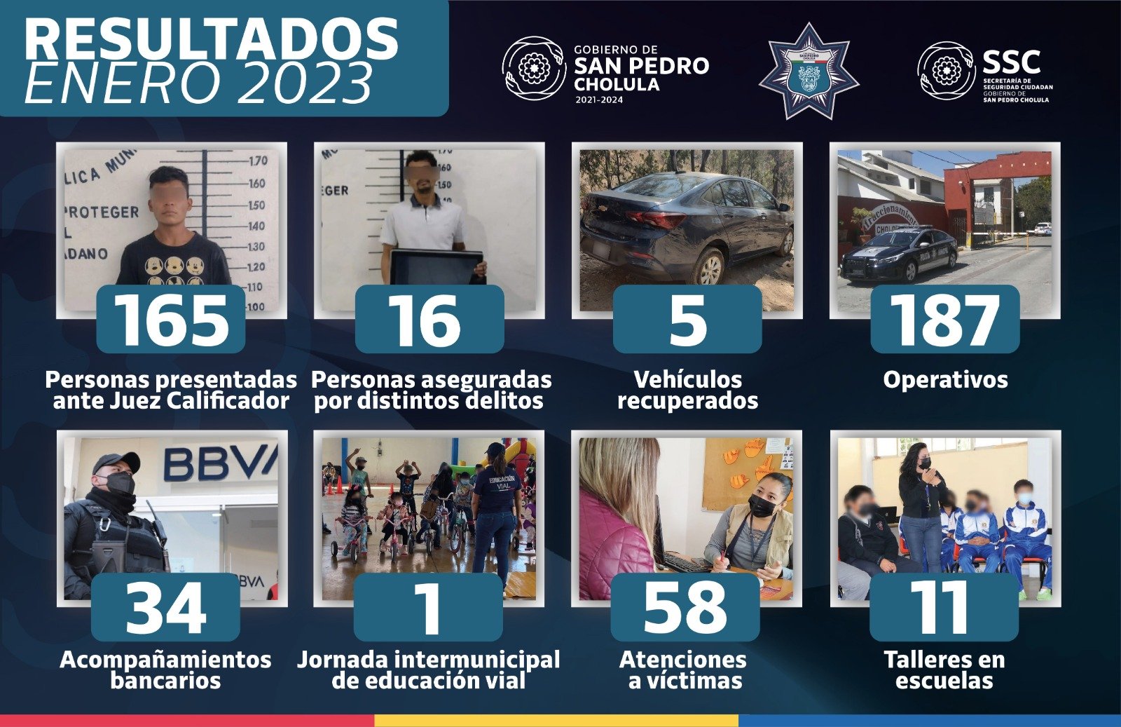 San Pedro Cholula, Puebla.- Como resultado de las estrategias implementadas en materia de seguridad, durante el mes de enero de 2023, la Secretaría de Seguridad Ciudadana de San Pedro Cholula (SSC Cholula) aseguró a 16 personas por su presunta participación en hechos delictivos, entre los cuales destacan la detentación de vehículo con reporte de robo, portación ilegal de arma de fuego, daños en propiedad ajena, lesiones, robo, entre otros.
