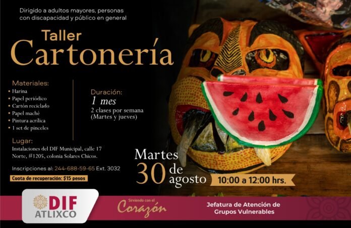 Atlixco, Puebla.- En un esfuerzo de impulsar el autoempleo y apoyar la economía los grupos vulnerables, el DIF Municipal de Atlixco del gobierno que encabeza, Ariadna Ayala, invita a los talleres de Cartonería, Barro de Policromado y Pintura en Tela, los cuales inician el próximo martes 30 de agosto.