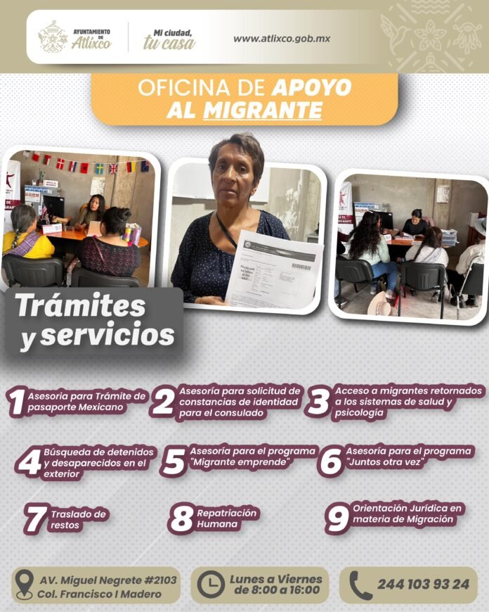 Atlixco, Puebla.- El Ayuntamiento de Atlixco, encabezado por Ariadna Ayala, ofrece apoyo integral a migrantes y sus familias a través de la Oficina de Apoyo al Migrante