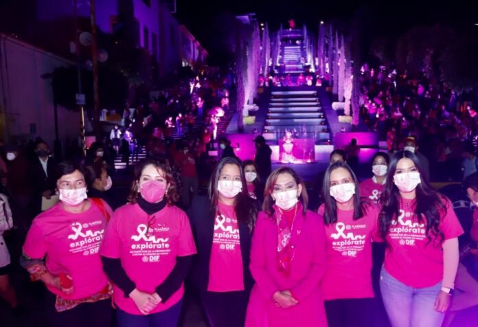 Al pie de las escalinatas se dieron cita representantes de los Poderes Ejecutivo y Legislativo, además las presidentas de los Sistemas Municipales DIF, así como personal del Sedif e integrantes del gabinete del Gobierno del Estado, para el conteo que dio paso al encendido de la luces rosas que tienen el objetivo de sensibilizar a la población para fomentar la autoexploración, la detección oportuna y atención inmediata del cáncer de mama, que es una de las principales causas de muerte entre las mujeres en el país.
