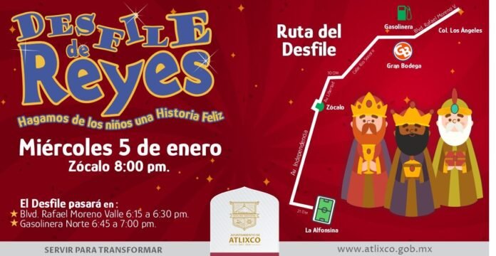 Atlixco, Puebla.- Como ya es tradición y con la participación de más de 800 voluntarios y 15 carros alegóricos, el día miércoles 5 enero se realizará el Desfile de Reyes, mismo que comenzará en el Boulevard Rafael Moreno Valle a la altura de la Gasolinera Norte, recorriendo calle  Río Sonora, 10 oriente, Avenida Libertad, Zócalo, Avenida Independencia, 21 oriente para culminar en el Campo Deportivo de La Alfonsina.