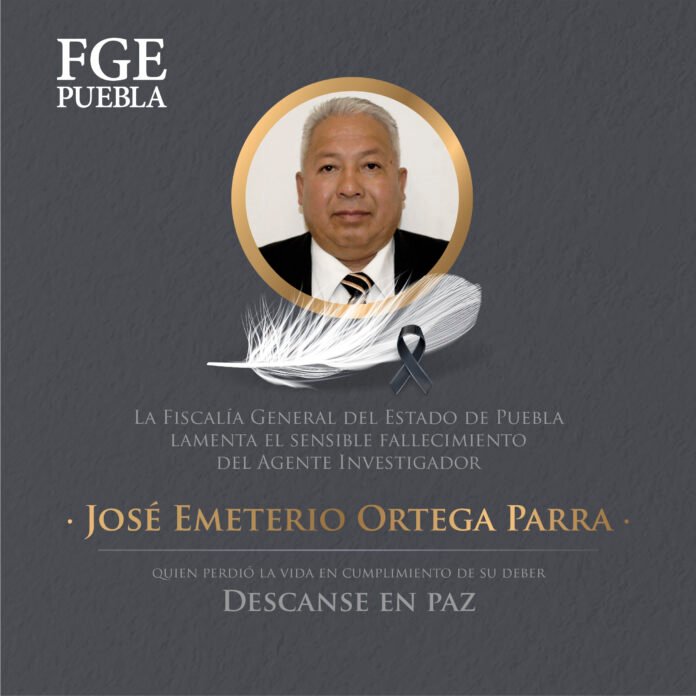 Puebla, Puebla (Mex).- La Fiscalía General del Estado de Puebla comunica que lamentablemente, en cumplimiento del deber, falleció el Agente Investigador José Emeterio Ortega Parra con más de 30 años de servicio. A su familia y seres queridos, la Institución expresa sus condolencias y les brinda apoyo.