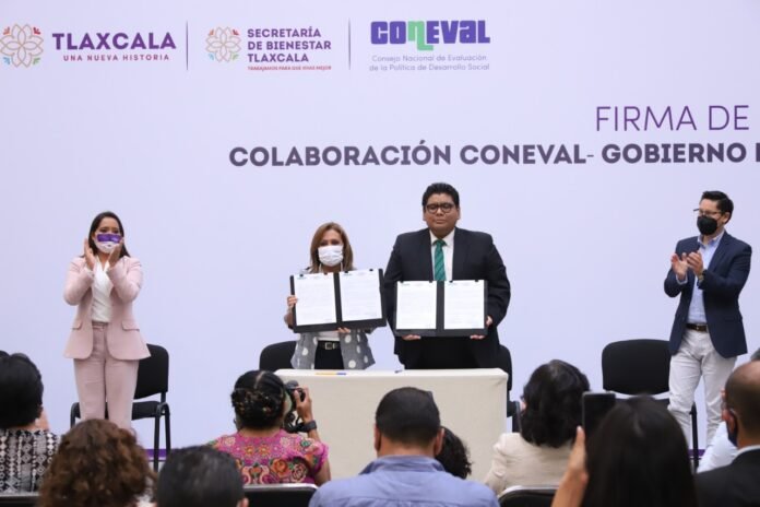 Tlaxcala, Tlaxcala (Mex).- La gobernadora Lorena Cuéllar Cisneros signó un Convenio de Colaboración con el Consejo Nacional de Evaluación de la Política de Desarrollo Social (Coneval), con el objetivo de fortalecer las herramientas técnicas que apoyen el monitoreo, implementación de estrategias focalizadas y evaluación de las políticas estatales de bienestar y desarrollo social para hacerlas más efectivas.
