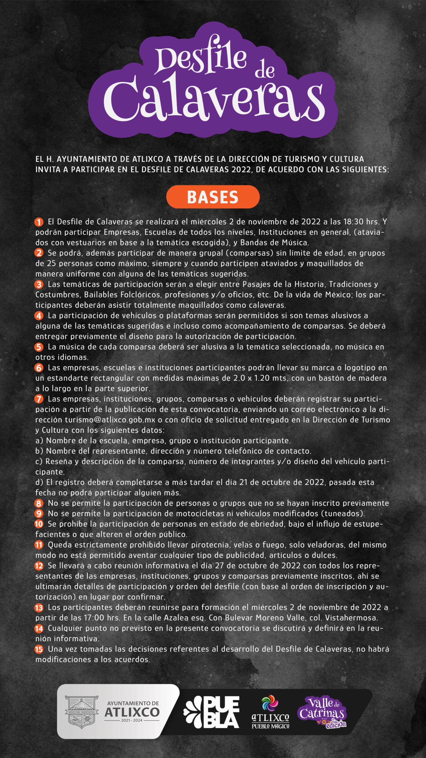 Atlixco, Puebla.- Con el objetivo de continuar preservando y fomentar nuestras tradiciones a través del arte y la cultura, el Ayuntamiento de Atlixco que encabeza la edil atlixquense, Ariadna Ayala, a través de la Dirección de Turismo y Cultura, invita a participar en Desfile de Calaveras, el cual se llevará a cabo el próximo 2 de noviembre por las principales calles de este municipio a partir de las 18:30 horas.