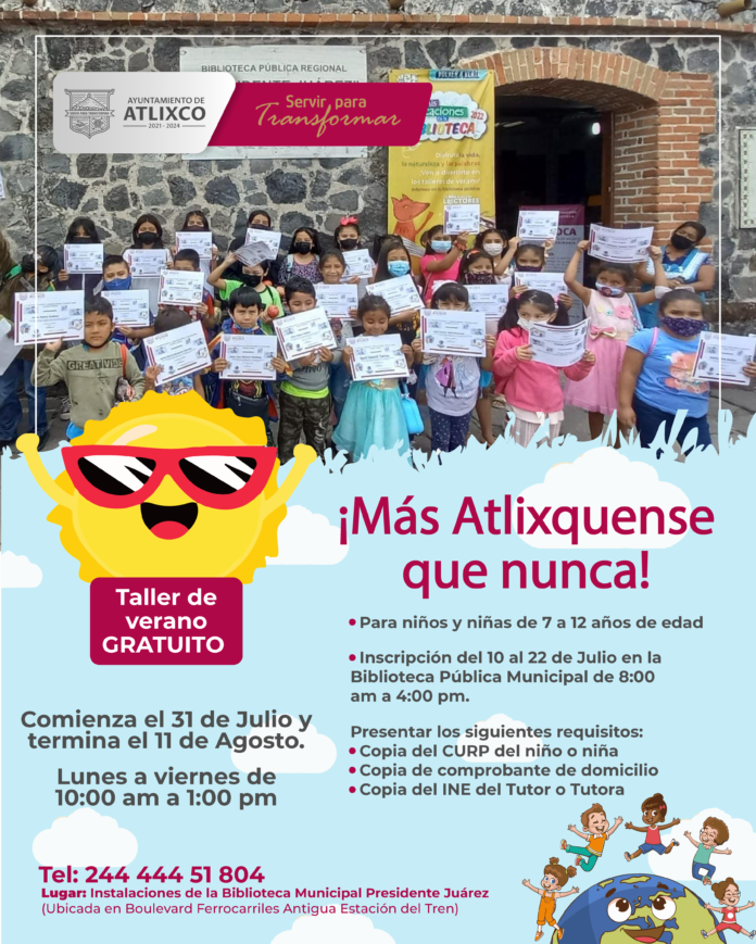 Atlixco, Puebla.- El Ayuntamiento de Atlixco que preside Ariadna Ayala con el objetivo de fomentar el sano esparcimiento de la niñez atlixquense y en apoyo a los padres de familia, a través de la Biblioteca Municipal “Presidente Juárez” se impartirá el Taller de Verano Gratuito: ¡Más atlixquense que nunca!.