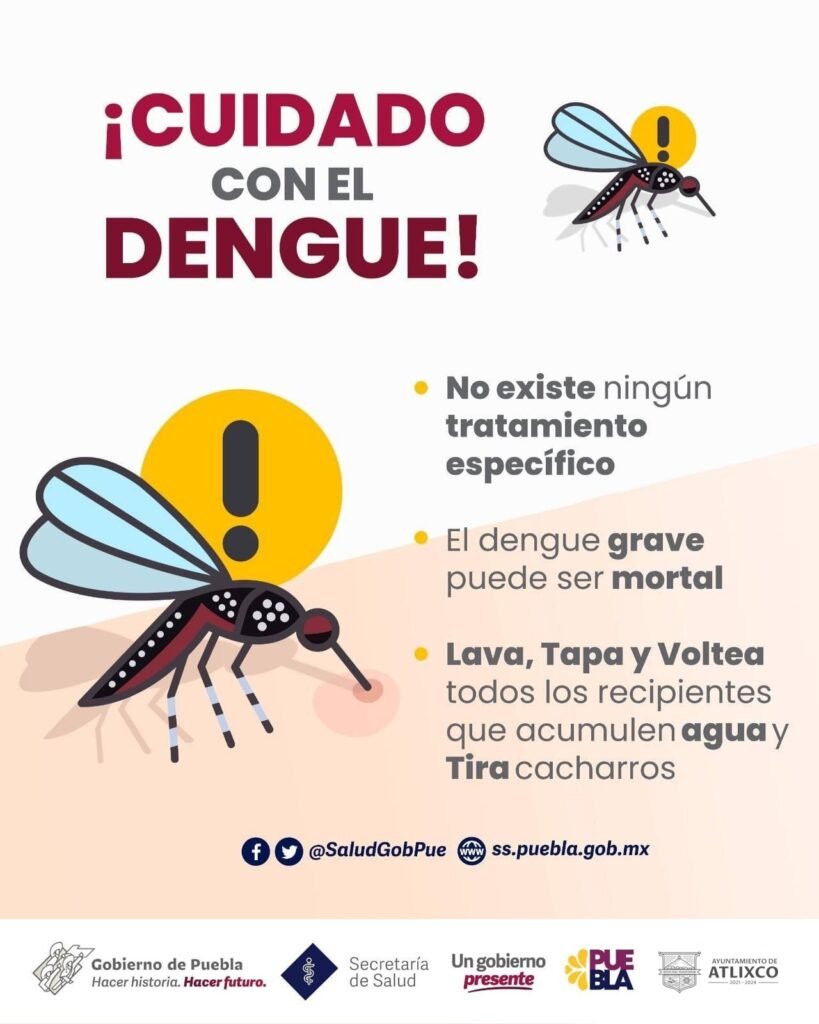 La comuna, recomienda a la ciudadanía hacer uso de mosquiteros y repelentes, así como limpiar las áreas verdes o traspatios, cerrar cisternas y cambiar el agua de los floreros. Para conocer la ruta que seguirá el camión recolector de cacharros, pueden consultar las redes sociales del Ayuntamiento de Atlixco, cada semana estarán compartiendo detalles.