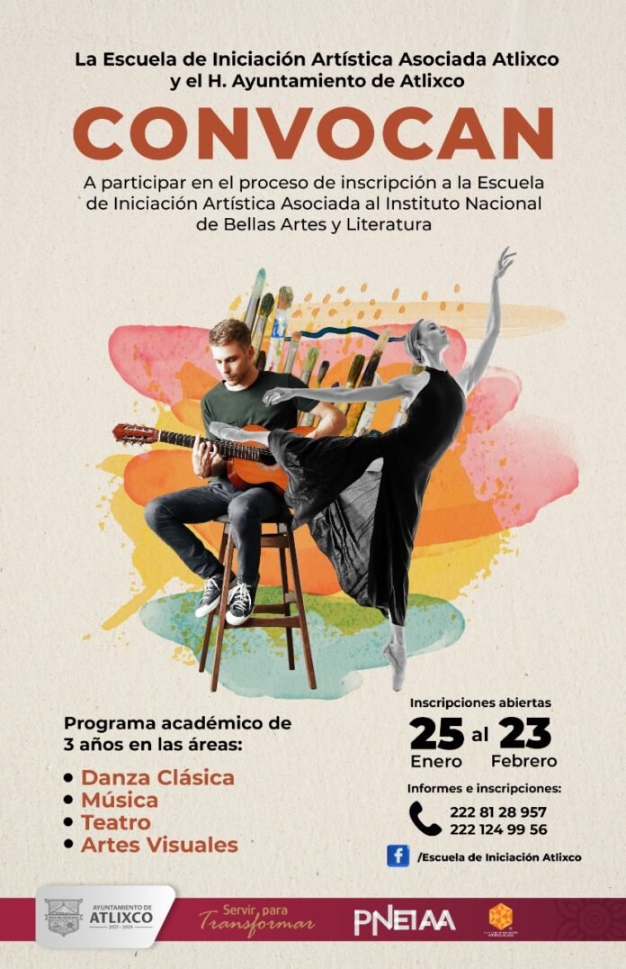 Atlixco, Puebla.- El ayuntamiento de Atlixco presidido por Ariadna Ayala, en coordinación con la Escuela de Iniciación Artística Asociada al Instituto Nacional de Bellas Artes y Literatura (INBAL) en Atlixco, convocan a niños y jóvenes a inscribirse en los programas académicos con duración de 3 años en las siguientes áreas: Danza clásica, música, teatro y artes visuales, hay disponibilidad de 20 lugares por cada disciplina, las inscripciones estarán abiertas hasta el 23 de febrero, para mayores informes e inscripciones se pueden comunicar a los teléfonos: (222) 812 8957 y (222) 124 9956 con la Maestra Loelia Ruíz, Directora de la Escuela de Iniciación Artística Asociada.