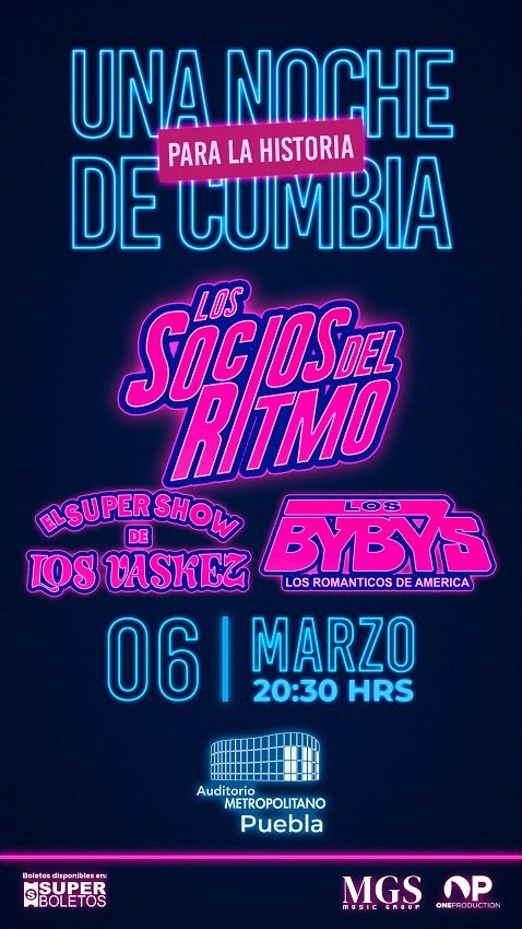 La ciudad de Puebla será testigo de una noche para la historia al reunir en formato Auditorio a tres de las agrupaciones más icónicas que ha dado nuestro país a la música tropical. Los Socios del Ritmo, El Súper Show de los Váskez y Los Bybys interpretarán sus mejores éxitos de ayer, de hoy y de siempre, demostrando por qué siguen siendo preferidos por el público de todas las edades.