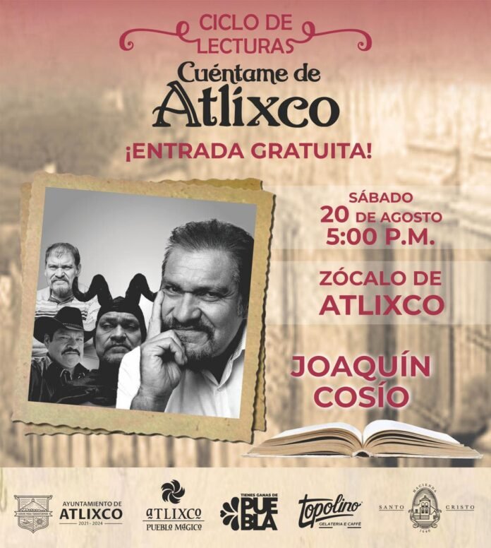 Atlixco, Puebla.- El Pueblo Mágico de Atlixco, presidido por Ariadna Ayala recibirá al actor Joaquín Cosío este sábado 20 de agosto, quien participará en una edición más del Ciclo de Lecturas, Cuéntame de Atlixco para narrar la historia de este bello municipio a través de cuentos.