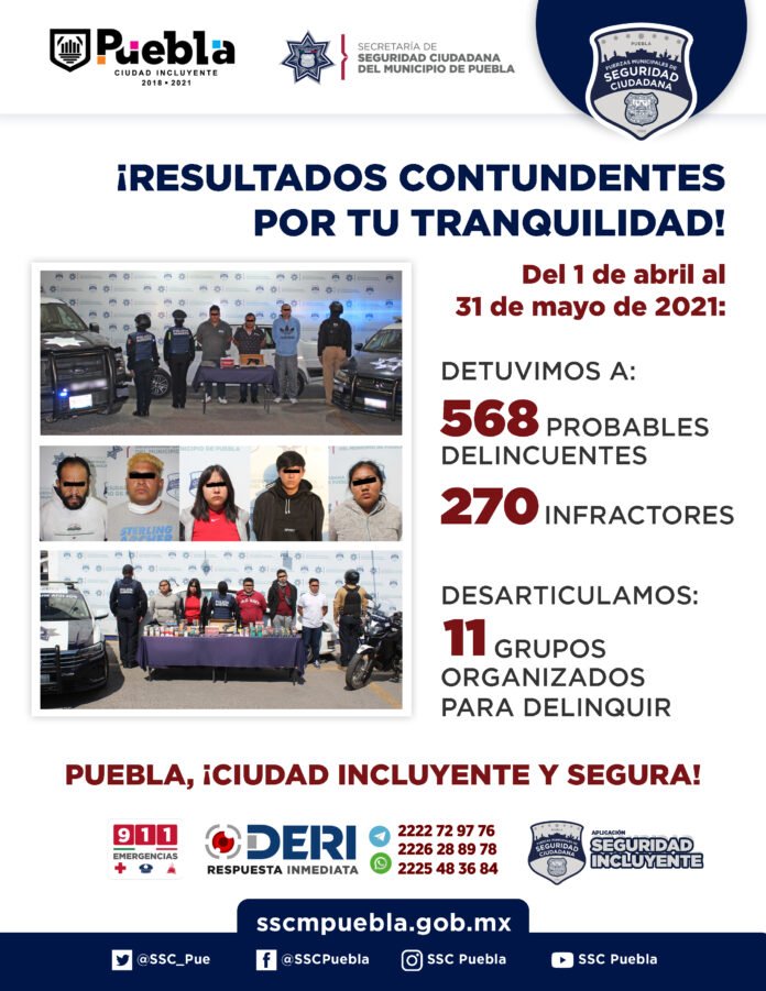 Puebla, México. – Derivado del fortalecimiento de acciones encaminadas al combate frontal contra la delincuencia, durante abril y mayo de este año, la Secretaría de Seguridad Ciudadana (SSC) del Municipio de Puebla reportó la detención de cerca de 900 personas y la desintegración de más de 10 grupos organizados para delinquir, entre otros resultados.