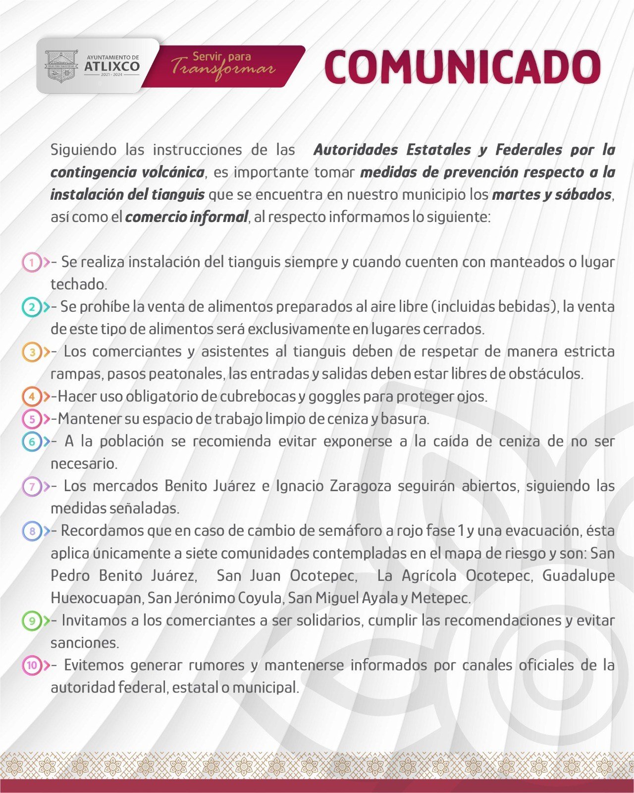 Es así que las reglas son muy simples peo tanto locatarios de los tianguis como vendedores ambulantes deberán acatarlas, ya que de los contrario se les podrían suspender sus actividades económicas y laborales.