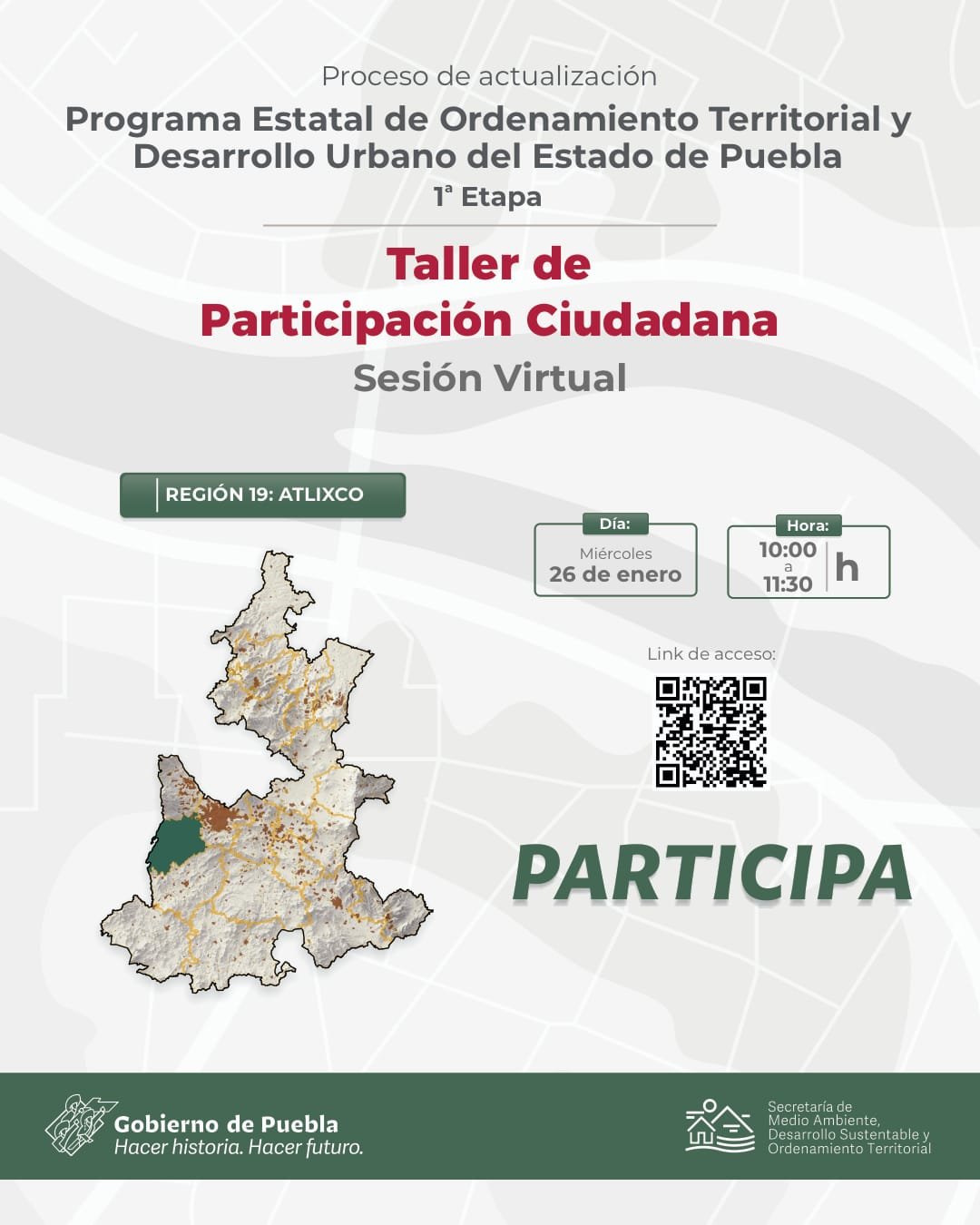 Atlixco, Puebla.- Como parte de los trabajos de actualización del Programa Estatal de Ordenamiento Territorial y Desarrollo Urbano, el Gobierno del Estado a través de la Secretaría del Medio Ambiente, Desarrollo Sustentable y Ordenamiento Territorial invita a los ciudadanos de Atlixco a participar en el “Taller de Participación Ciudadana, Región 19” el cual se llevará a cabo el próximo 26 de enero a las 10:00 horas, bajo la modalidad virtual, mediante la plataforma Zoom.