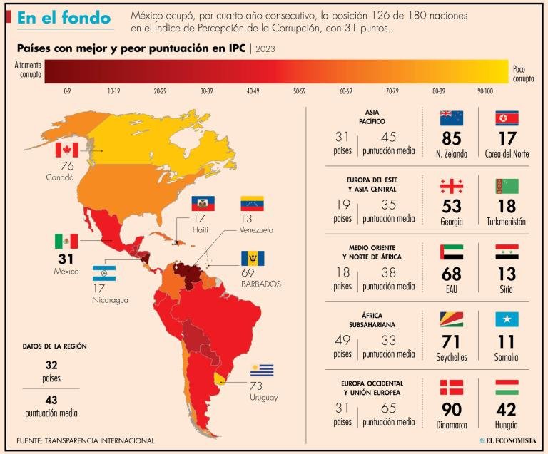 Hace unos días fue publicado el Índice de Percepción de la Corrupción 2024, con muy malos resultados para nuestro país, la calificación de México es de 26 sobre un total de 100 puntos, ubicándonos en el lugar 143 entre 180 países. La Organización para la Cooperación y el Desarrollo Económico (OCDE), reporta que México aparece en el último lugar de la lista de corrupción entre 38 Estados del mundo. La pérdida de puntos ha venido empeorando notablemente desde el 2014. A nivel de la dinámica de los países, en el período 2012 y 2024, 101 países mantuvieron su nivel de índice, 32 mejoraron y 47 -incluido México- bajaron su calificación.