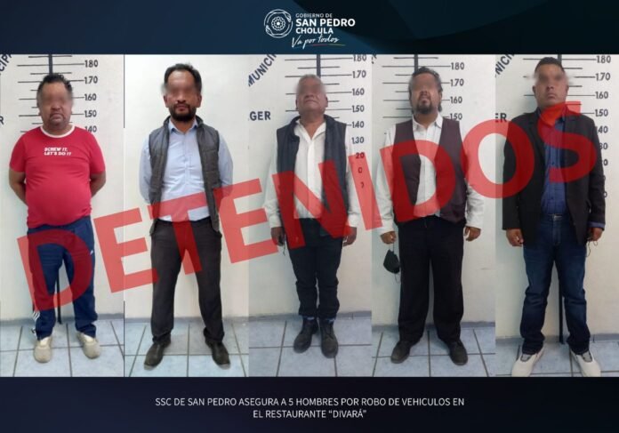 San Pedro Cholula, Pue.- La Secretaría de Seguridad Ciudadana aseguró a cinco masculinos presuntamente involucrados en el robo de vehículos registrado la tarde de este domingo en el estacionamiento del Restaurante Divará.