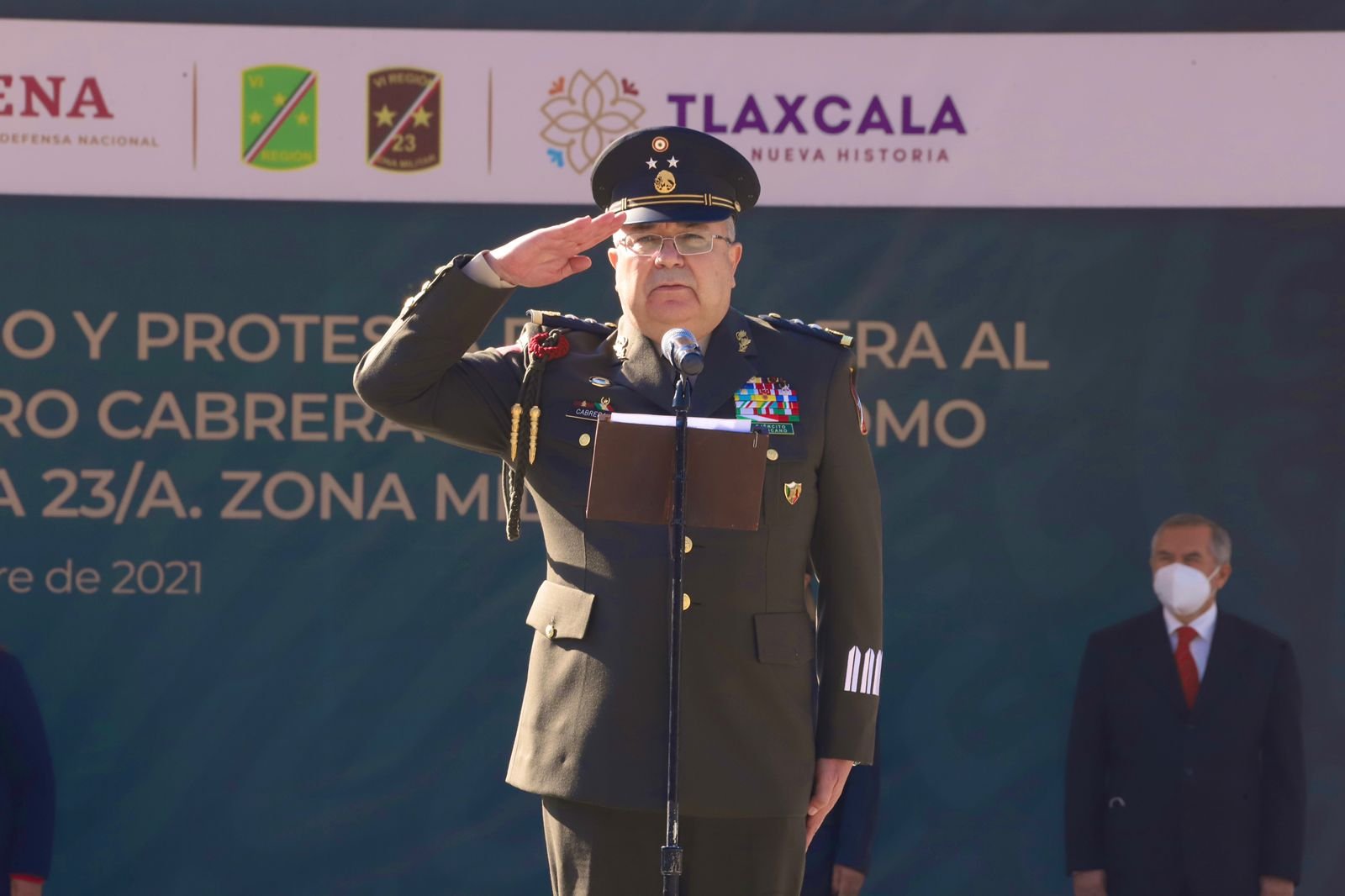 Tlaxcala, México.- La gobernadora Lorena Cuéllar Cisneros asistió a la ceremonia de la toma de posesión y protesta de bandera del General de Brigada Diplomado de Estado Mayor, Gumaro Cabrera Osornio, como nuevo comandante de la 23 Zona Militar, ubicada en el municipio de Panotla.