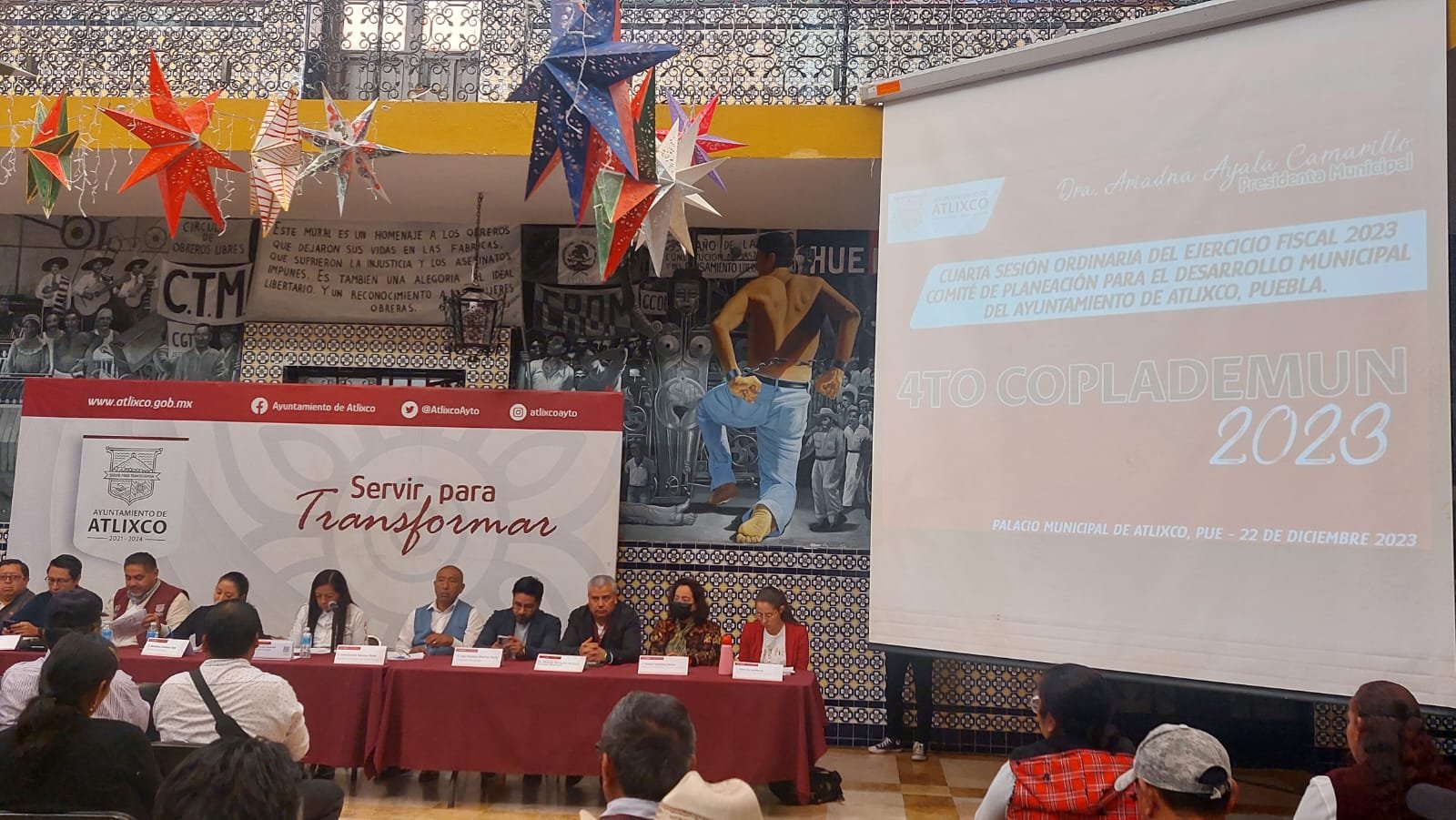 Atlixco, Puebla.- Durante la cuarta sesión del Comité de Planeación para el Desarrollo Municipal (COPLADEMUN), la presidenta municipal, Ariadna Ayala informó a inspectores y presidentes auxiliares el estatus de las obras realizadas en 2023, así como el listado de obras programadas para 2024, siendo esta una pre-priorización, cabe mencionar que las autoridades auxiliares, tienen hasta el 10 de enero del siguiente año, para ingresar peticiones.