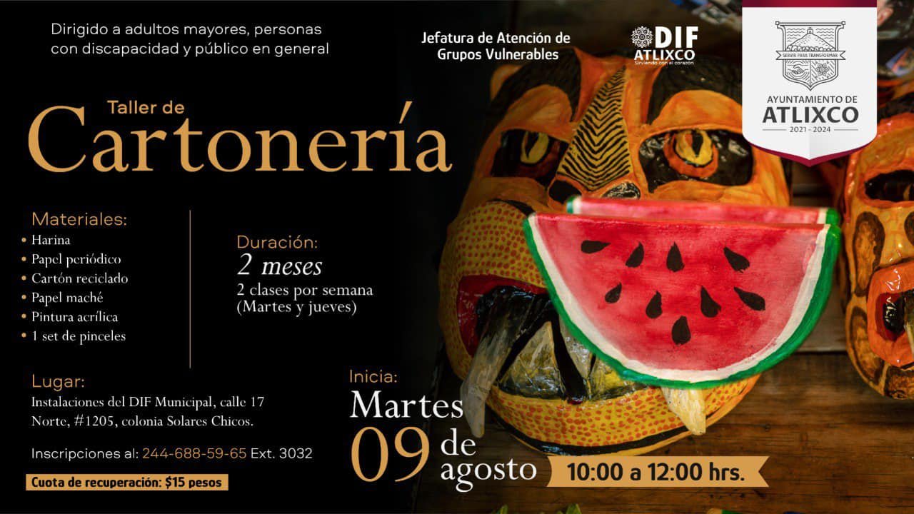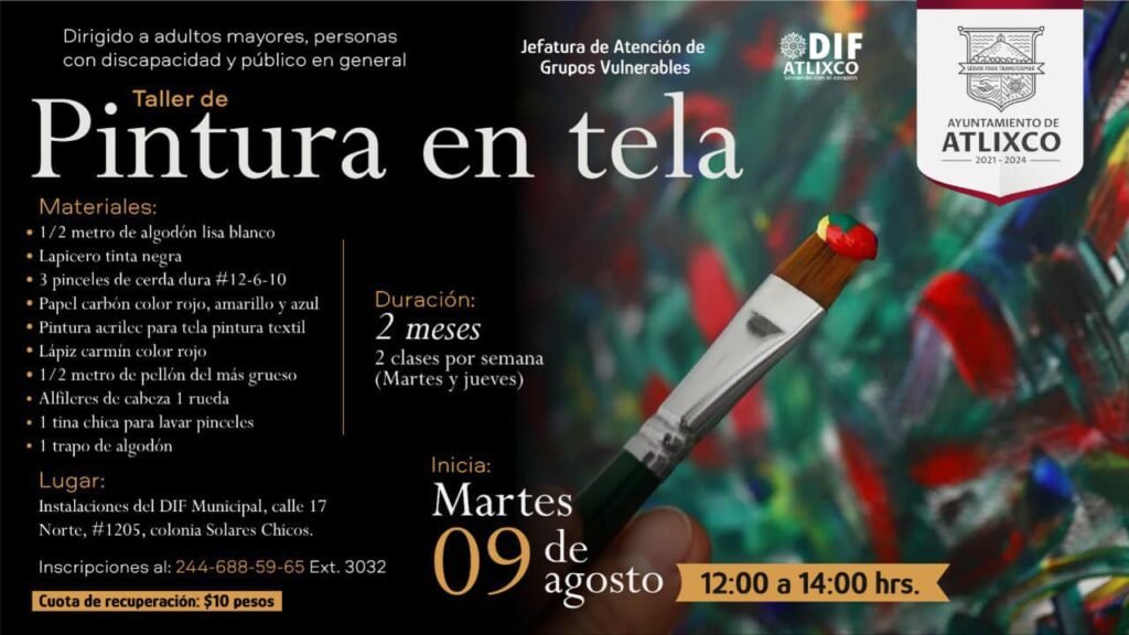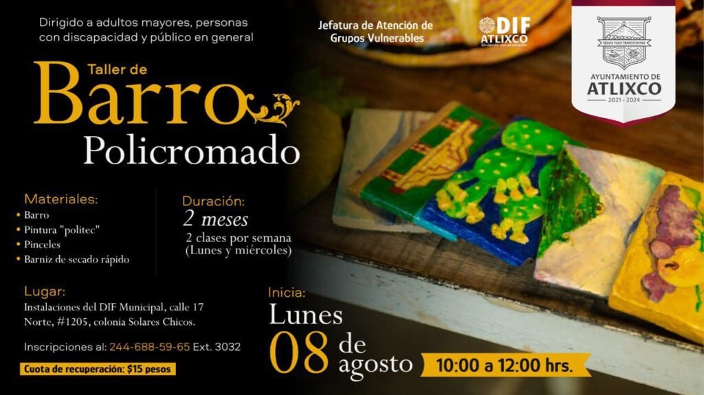Como parte de este ciclo de talleres, el próximo lunes 8 y martes 9 de agosto, los atlixquenses podrán participar en las nuevas clases de Barro Policromado, Cartonería y Pintura en Tela; las inscripciones se realizan al 244-688-59-65 ext.3032 de lunes a viernes de 8 a 16 horas. Los términos y requisitos pueden consultarse en las páginas de Facebook: DIF Municipal Atlixco o Ayuntamiento de Atlixco.