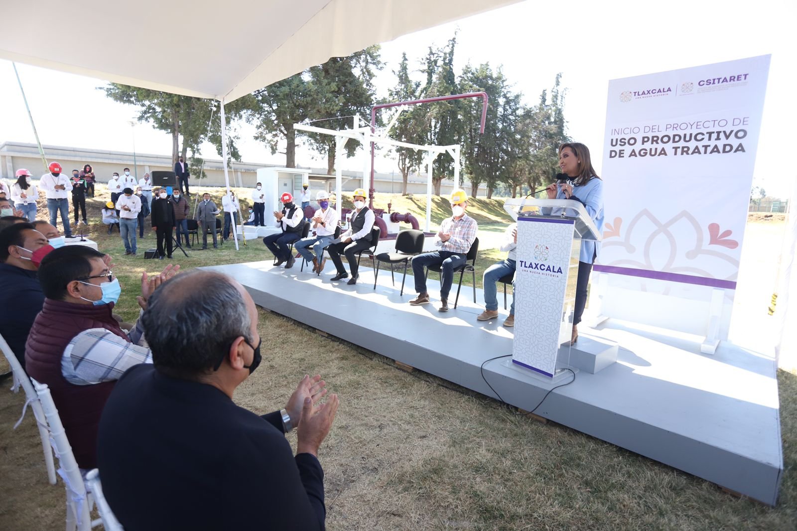 Tlaxcala, México.- La gobernadora Lorena Cuéllar Cisneros puso en marcha el proyecto de uso productivo de agua tratada en el Centro de Servicios Integrales para el Tratamiento de Aguas Residuales del Estado de Tlaxcala (Csitaret), con lo cual se amplían las acciones para el cuidado del medio ambiente.