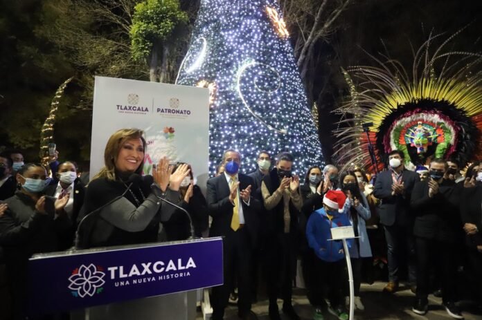 Tlaxcala, México.- Acompañada de familiares y miembros de su gabinete, la gobernadora Lorena Cuéllar Cisneros realizó el tradicional encendido del árbol de Navidad en la Plaza de la Constitución de la ciudad capital, con lo que iniciaron los festejos decembrinos en la entidad.
